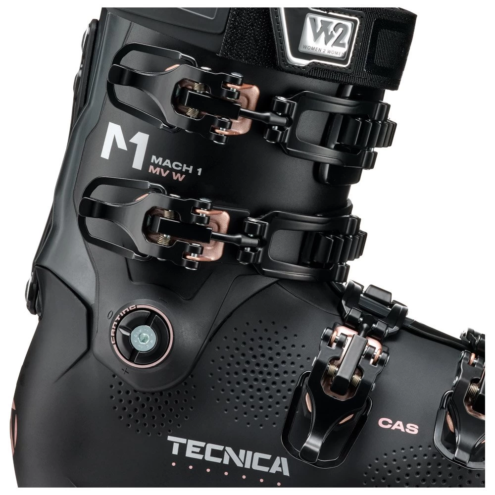La Mach1 Mv 105 W Td Gw Black est une chaussure de ski pour femme. Le flex de 105 de la chaussure lui permet d’apporter de la puissance aux skieuses sportives sans pour autant être trop fatigante à manier. La coque C.A.S Cuff Adapt est adaptée à la morphologie féminine et permet d’éliminer les points de pression au niveau du mollet. Les quatres crochets en aluminium et le strap de 35 mm permettent d’assurer un soutien ferme lorsque vous vous engagez à fond sur les pistes en appuis languette. Son volume chaussant de 100 mm la destine plutôt aux skieuses ayant les pieds moyens et qui recherchent à la fois de la précision et du confort. Nous conseillons cette chaussure assez puissante aux skieuses de bon niveau physique et technique.