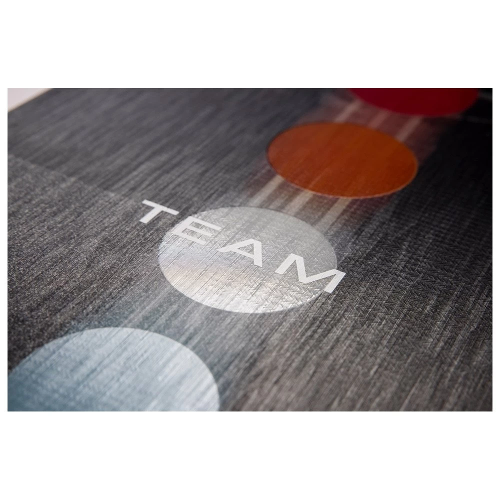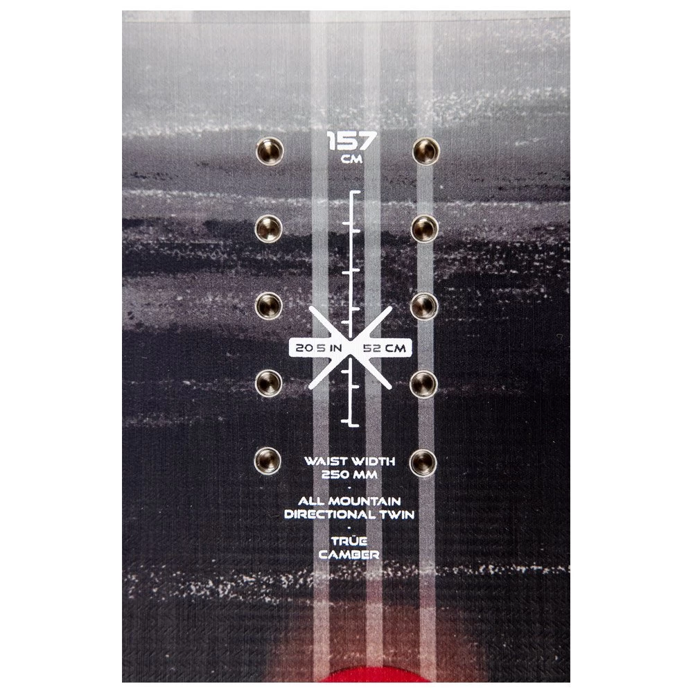 La Nitro Team est dotée d’un shape twin directionnel qui permet d’avoir beaucoup de polyvalence et de maniabilité tout en gardant de belles aptitudes en freestyle. En effet, puisque le tail et le nose sont symétriques, il est possible de faire du switch, et avoir un vrai tail peut aussi être un atout même pour les tricks qui ne demandent pas à passer en switch. Le côté directionnel, avec des inserts légèrement reculés vers l’arrière, permet de faciliter l’enclenchement des virages (quand vous n’êtes pas en switch) et apporte en plus une déjauge automatique dans la poudreuse. Côté construction, on retrouve un noyau bois renforcé de fibres de verre, quelque chose de très classique donc, qui apporte un flex pêchu tout en gardant de la jouabilité aux spatules. Enfin, le cambre classique bien marqué sur toute la longueur de la board offre une très bonne tenue de carre sur neige dure et damée et permet de profiter à fond de l’énergie du noyau bois pour popper de gros ollies, aller chercher du rebond dans les virages en carving, etc.